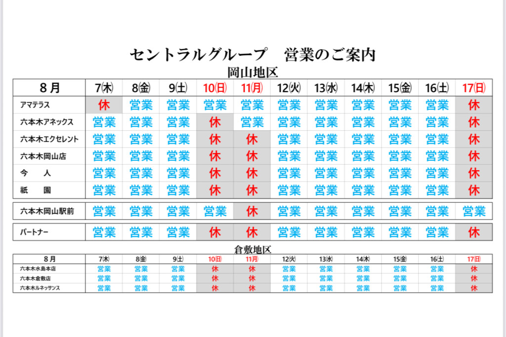出勤情報 TOP > 出勤情報 > 本日月曜日店休日です。 出勤情報NEWS & TOPICS 2025.08.11本日月曜日店休日です。 本日8月11日月曜日は店休日となっております。 明日12日火曜日12:00~営業いたしますので よろしくお願いいたします♪ 8月9月の店休日のお知らせ 8月9月の毎週月曜日店休日と 8/26火曜店休日 9/16火曜店休日 9/23火曜店休日 が店休日となっております。 前へ 次へ
